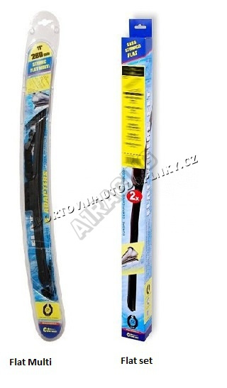 Stěrače FLAT SET (sada 2 ks na celé auto). Vysoce kvalitní pružný člen plochého stěrače zajišťuje stejnoměrný tlak grafitového břitu v celé jeho délce, což zamezuje rozmazávání nečistot a vytváření pruhů.