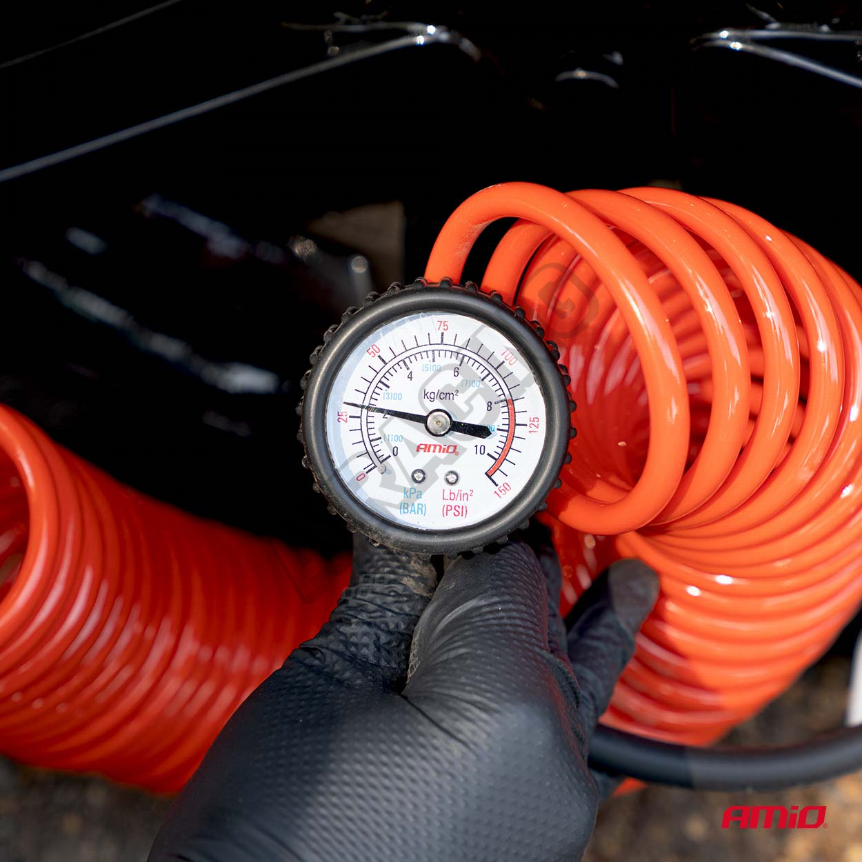 Kompresor je vybaven flexibilnou vzduchovou hadicou o dĺžke 8 m a napájacím káblom 2,4 m, čo umožňuje voľné operovanie okolo vozidla. V sade sa nachádzajú tri vymeniteľné koncovky na pumpovanie rôznych typov ventilov – automobilových, cyklistických a pre športovo-rekreačné príslušenstvo.
