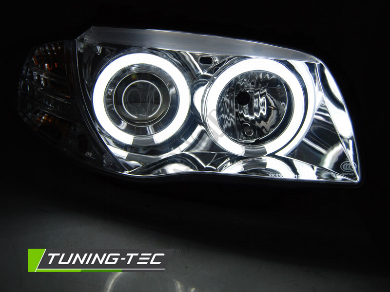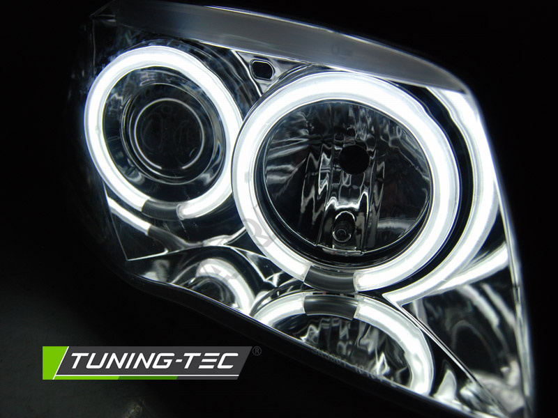 Číra optika s chróm pozadím s bielo silnými CCFL svietiacimi kroužkama efektne vylepší váš model, svetlá majú EÚ homologáciu, osadená sú žárovkama H7, cena je za celú sadu 2 ks
