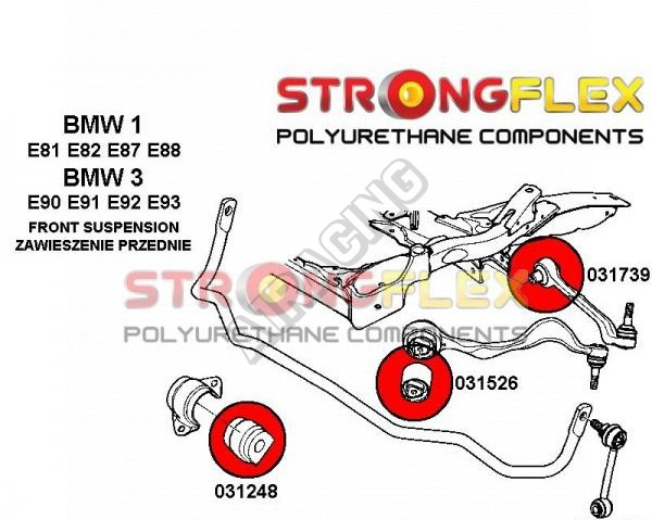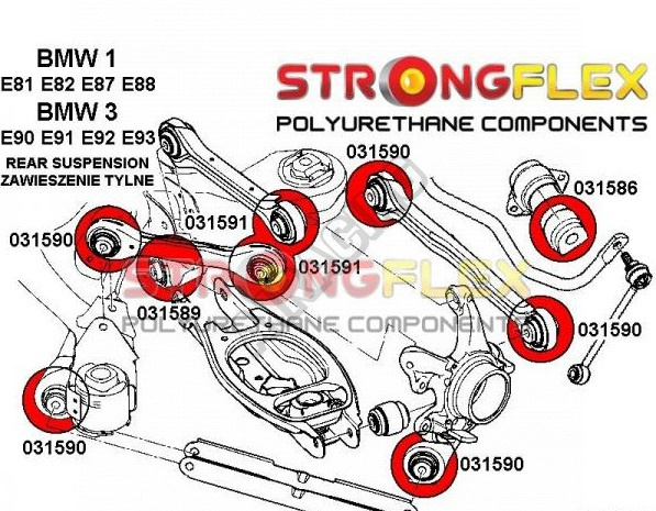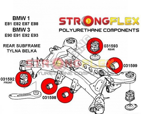 BMW rad 1 (E87, E81) StrongFlex Sport (tvrdosť 90ShA) kompletná zostava silentblokov na celé auto obsahuje: