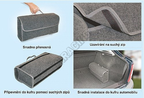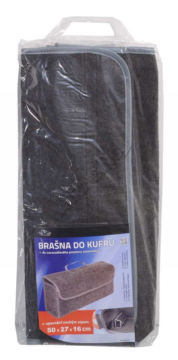 Univerzální textilní brašna, určená především do zavazadlového prostoru osobního automobilu. Uzavíratelná na suchý zip, snadno přenosná díky uchu na horní straně. Pásy suchého zipu na spodní i zadní straně pro snadné přichycení do zavazadlového prostoru automobilu. Velikost 50 x 25 x 15 cm.