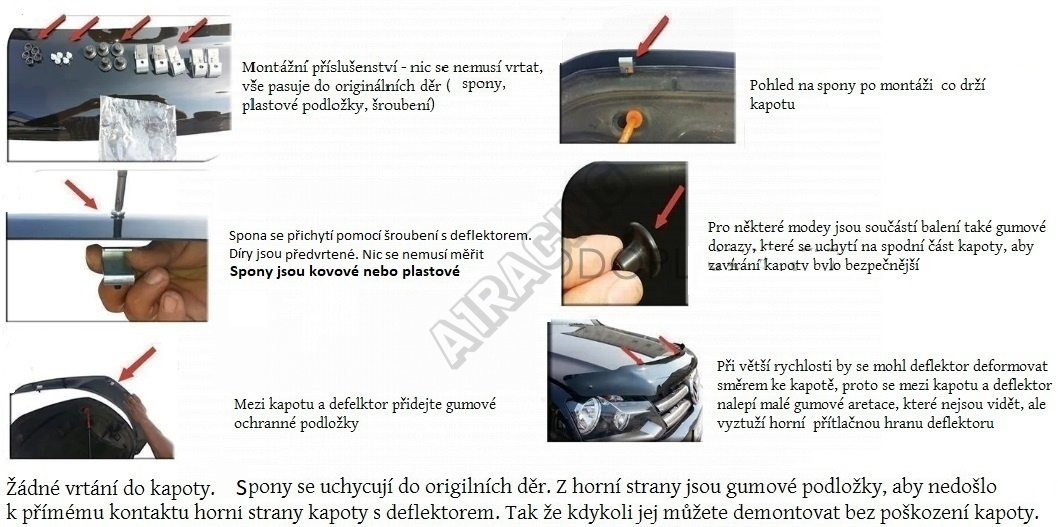Pozor: Nič sa nemusí vŕtať. Všetko sa inštaluje na pôvodné uchytenie z vnútornej strany kapoty. V hornej časti je priehľadná fólia, ktorá pred použitím sa zloží dole.