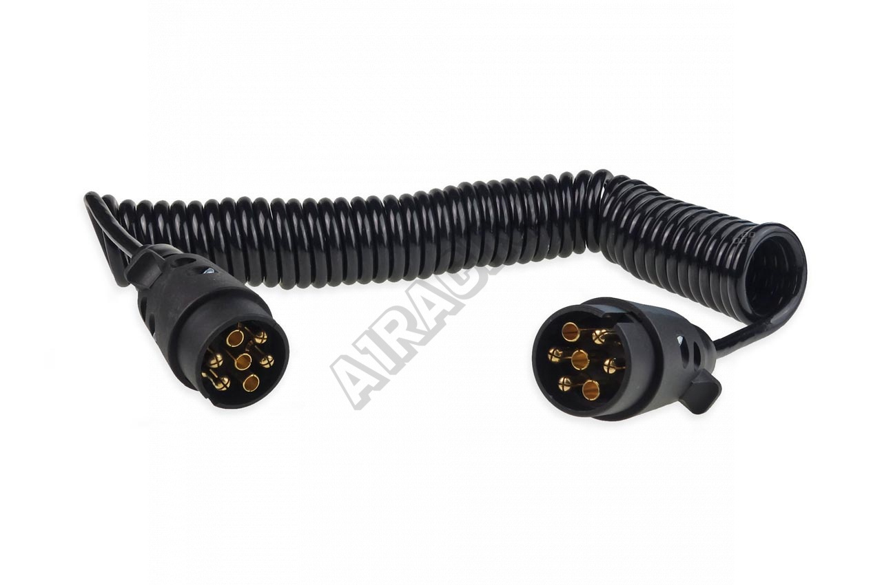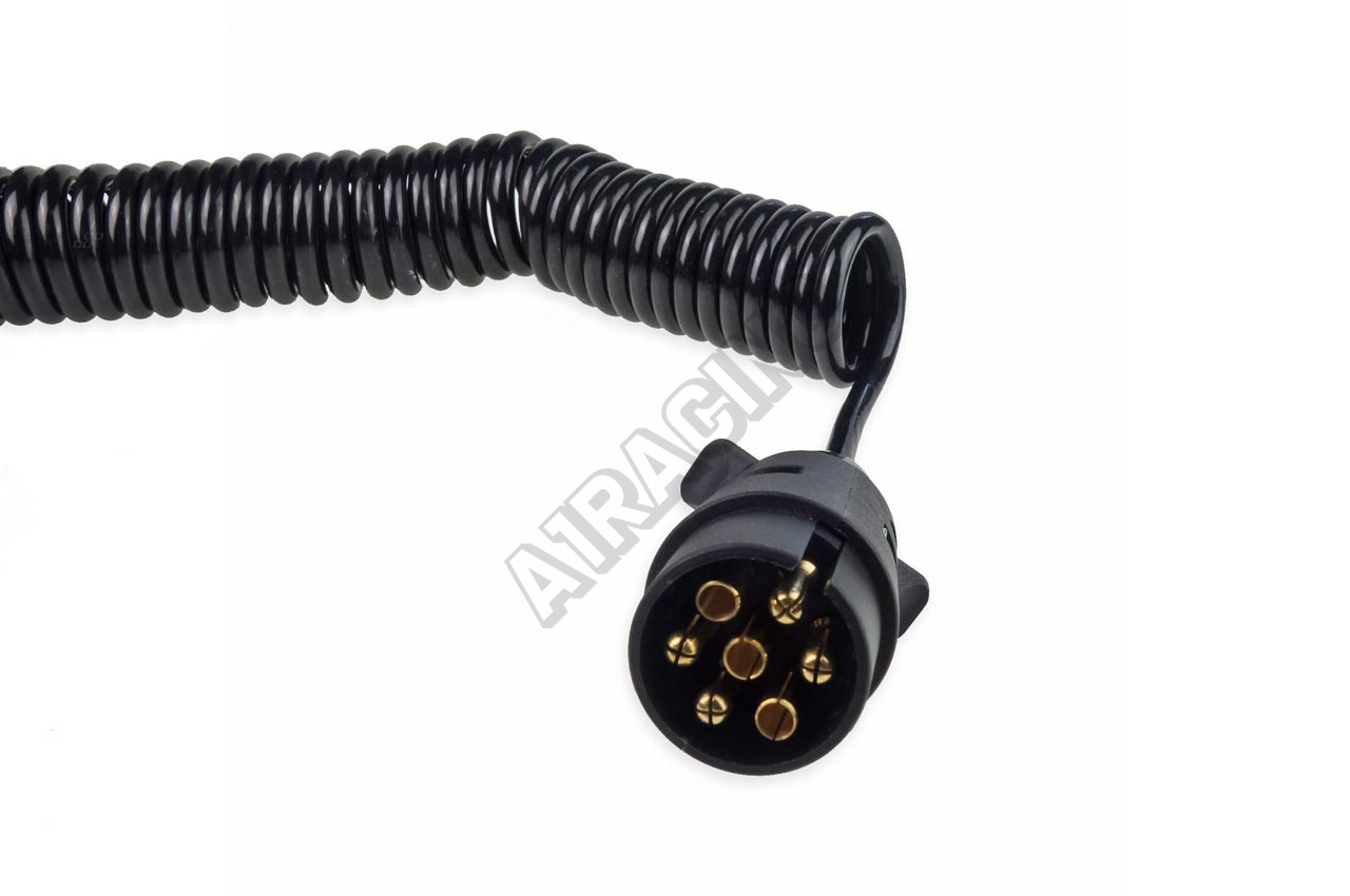 Špirálový kábel 7-pinový. Zabezpečí dobré spojenie, pretože vďaka špirálovitému tvaru ho možno natiahnuť do dĺžky približne 6 m. Na oboch koncoch sa nachádza plastová zástrčka 7PIN. TECHNICKÉ PARAMETRE: Materiál: PVC Napájanie: 12 V Dĺžka po rozložení 6 m 2x koncovka 7-pólová