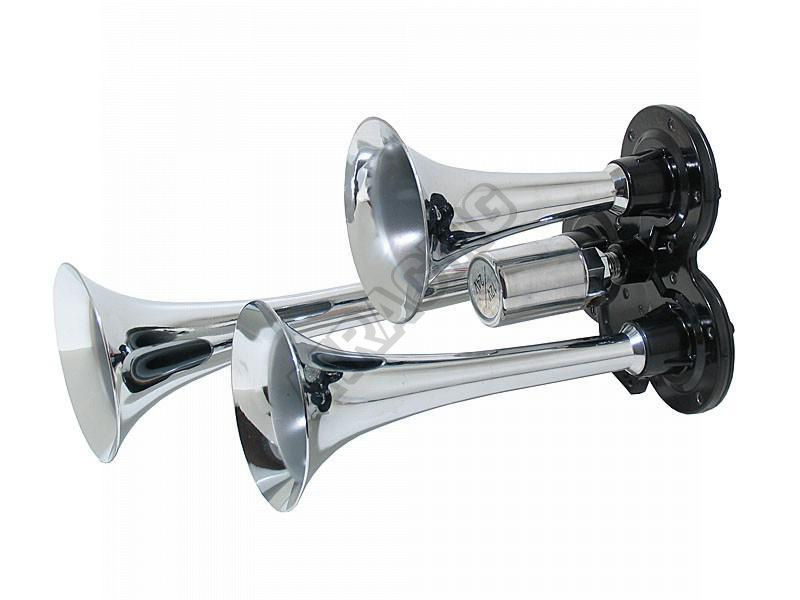 Fanfára - chróm 3 trubky 12V / 24V Vzduchová fanfára s elektromagnetickým ventilem 12/24V. Nutno