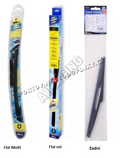 Stěrače FLAT SET (sada 2 ks na celé auto). Vysoce kvalitní pružný člen plochého stěrače zajišťuje stejnoměrný tlak grafitového břitu v celé jeho délce, což zamezuje rozmazávání nečistot a vytváření pruhů.