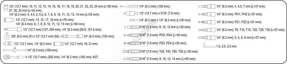 Sada obsahuje dvě ráčny, celou řadu bitů, adaptérů, nástavců 1/2"a 1/4" vše uspořádáno v přehledných pozicích.