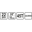 Sada obsahuje ráčnu s 45 zuby, prodlužovacích nástavců, celou řadu nástavců 3/8" a kloubového nástavce, vše je přehledně uspořádáno.