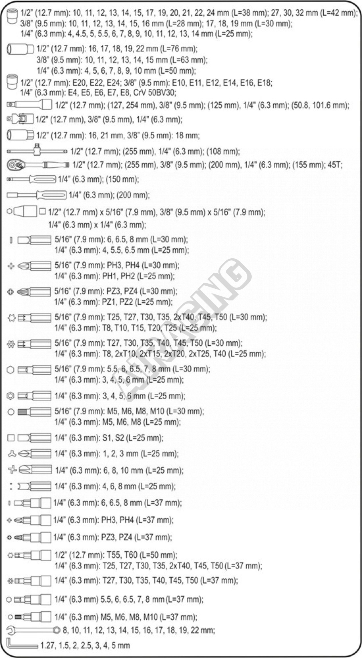 - 15x nástavec 1/2": 10; 11; 12; 13; 14; 15; 17; 19; 20; 21; 22; 24; 27; 30; 32 mm