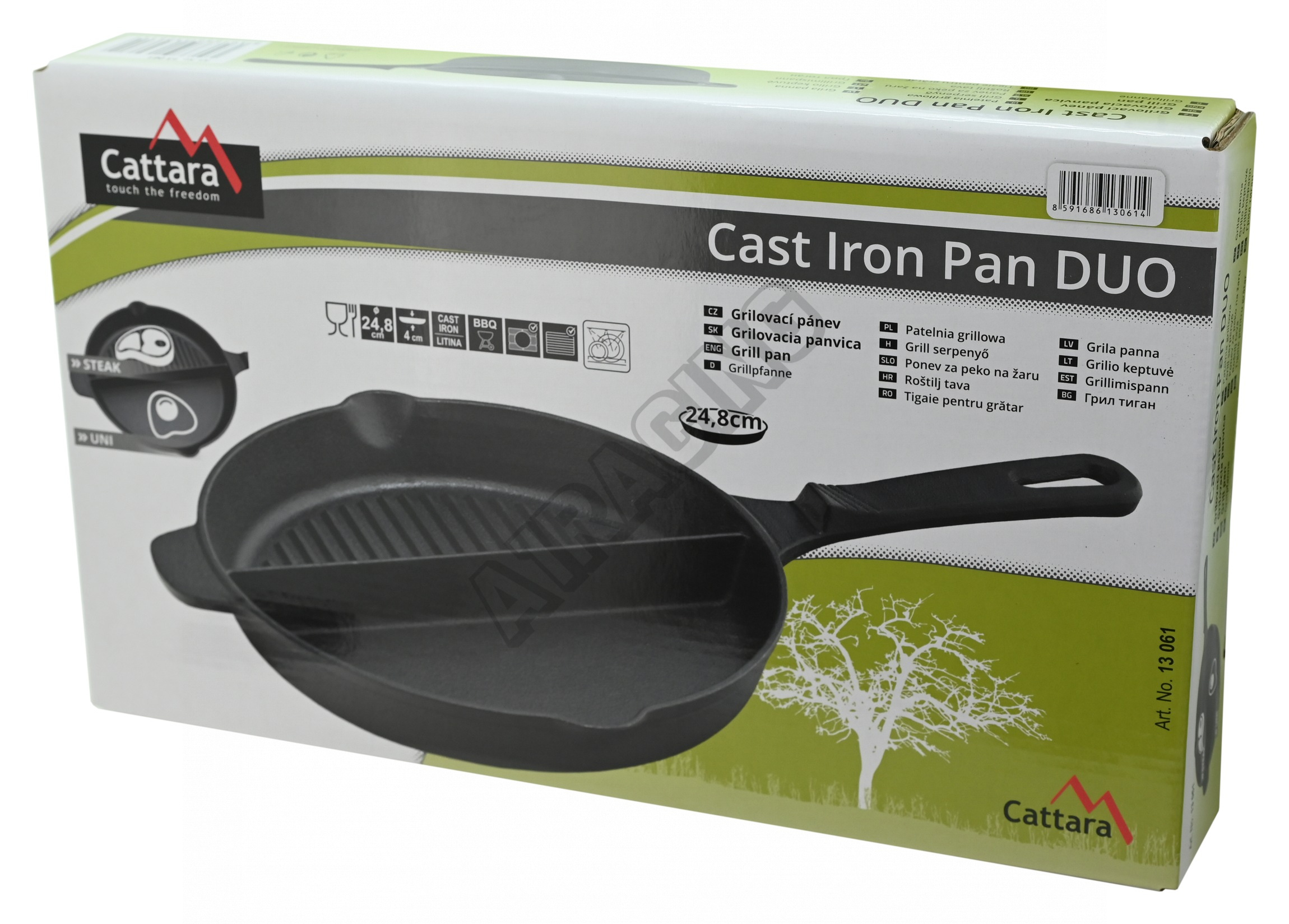 Grilovací pánev z litiny průměru 25cm se dvěma prostory pro přípravu pokrmů.
