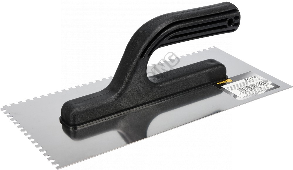 Nerezová omítací stěrka 125x270 mm se zuby 4x4 mm. Plastová rukojeť