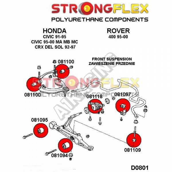 Honda Civic 1992-95 StrongFlex Sport (tvrdost 90ShA) kompletní sestava silentbloků na celé auto obsahuje :