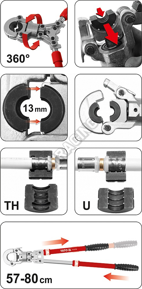 Kleště jsou vybaveny hydraulickým pohonem, který umožňuje lisování silou až 60 kN. Otočná hlava umožňuje práci v těžko přístupných místech. Rukojeti kleští jsou teleskopické, lze je prodloužit z 57 cm až do 80 cm a tím vytvořit ještě větší páku pro důkladné spojení.