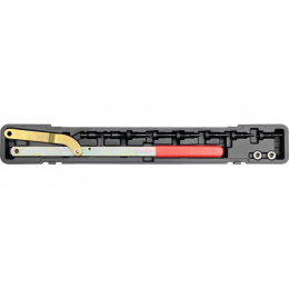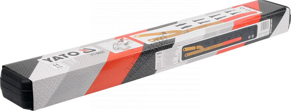 Souprava obsahuje celkem 11 kusů příslušenství. Dvě matice, samotný klíč a čepy průměrů 6 - 10 mm; 8 - 11 mm; 10 - 12 mm; 11 - 16 mm.