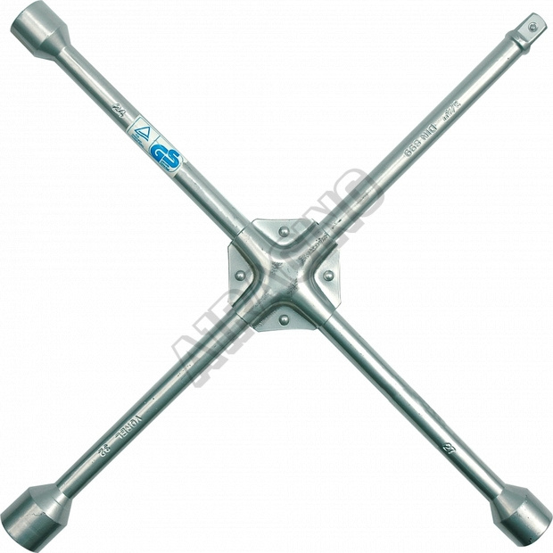 Celokovový klíč ve tvaru kříže, který je určen pro povolování či utahování matic kol automobilů. Na