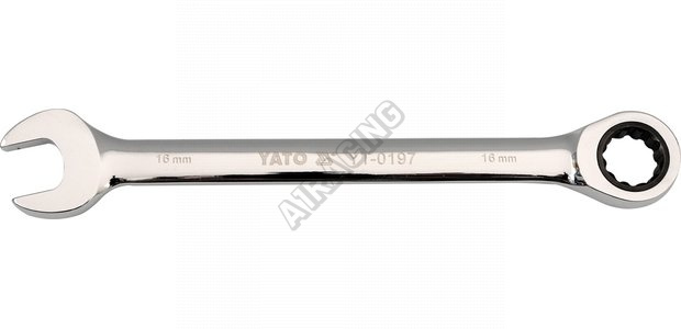 Ráčnový očkoplochý klíč Yato - na jedné straně klasický stranový klíč, na straně druhé očkový klíč s dvanáctihranným profilem vybaveným ráčnou s jemným dělením 72 zubů. Tělo klíče je vyrobeno z chromvanadiové oceli CrV6140. Povrch je vyleštěn do vysokého lesku.