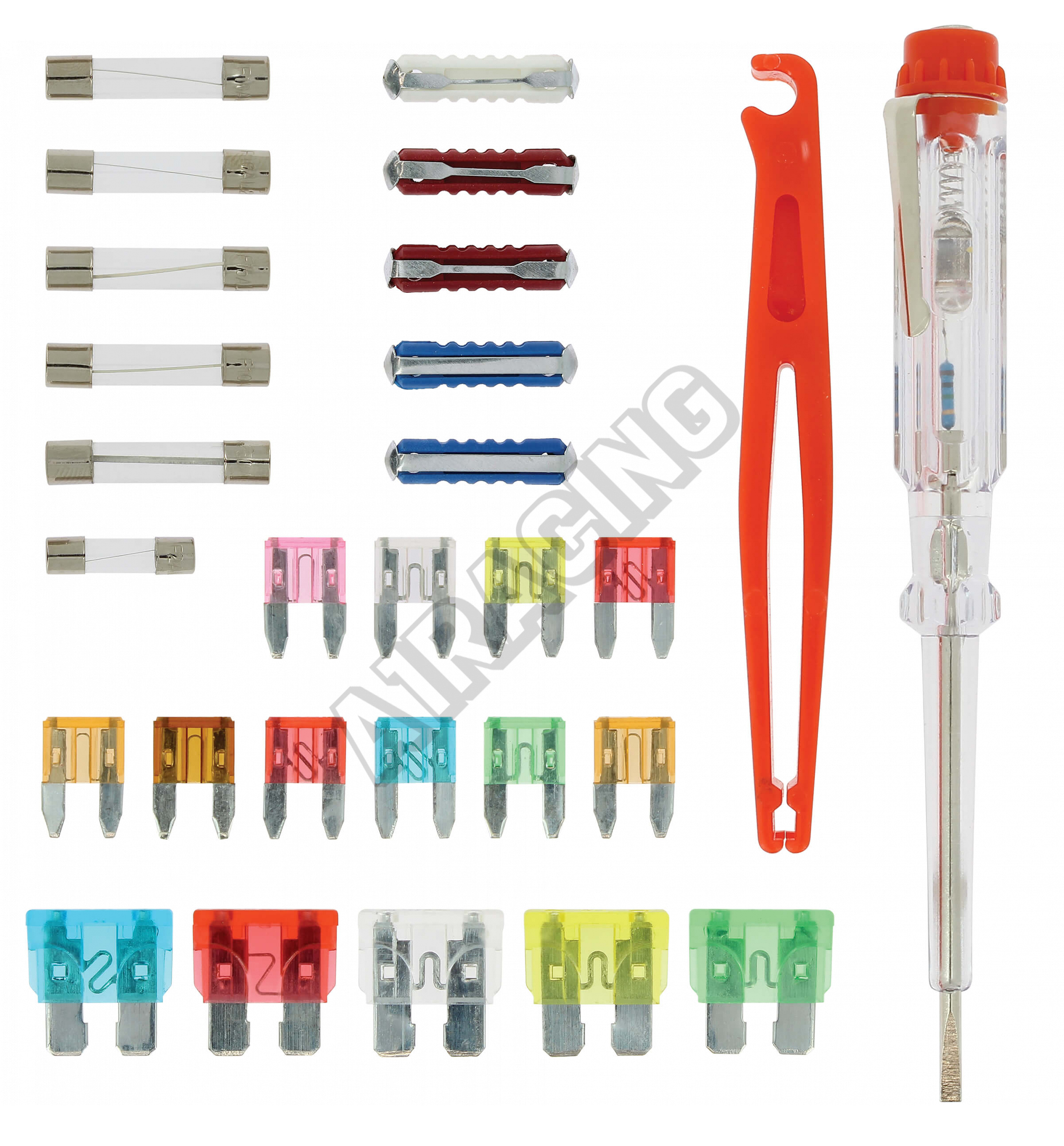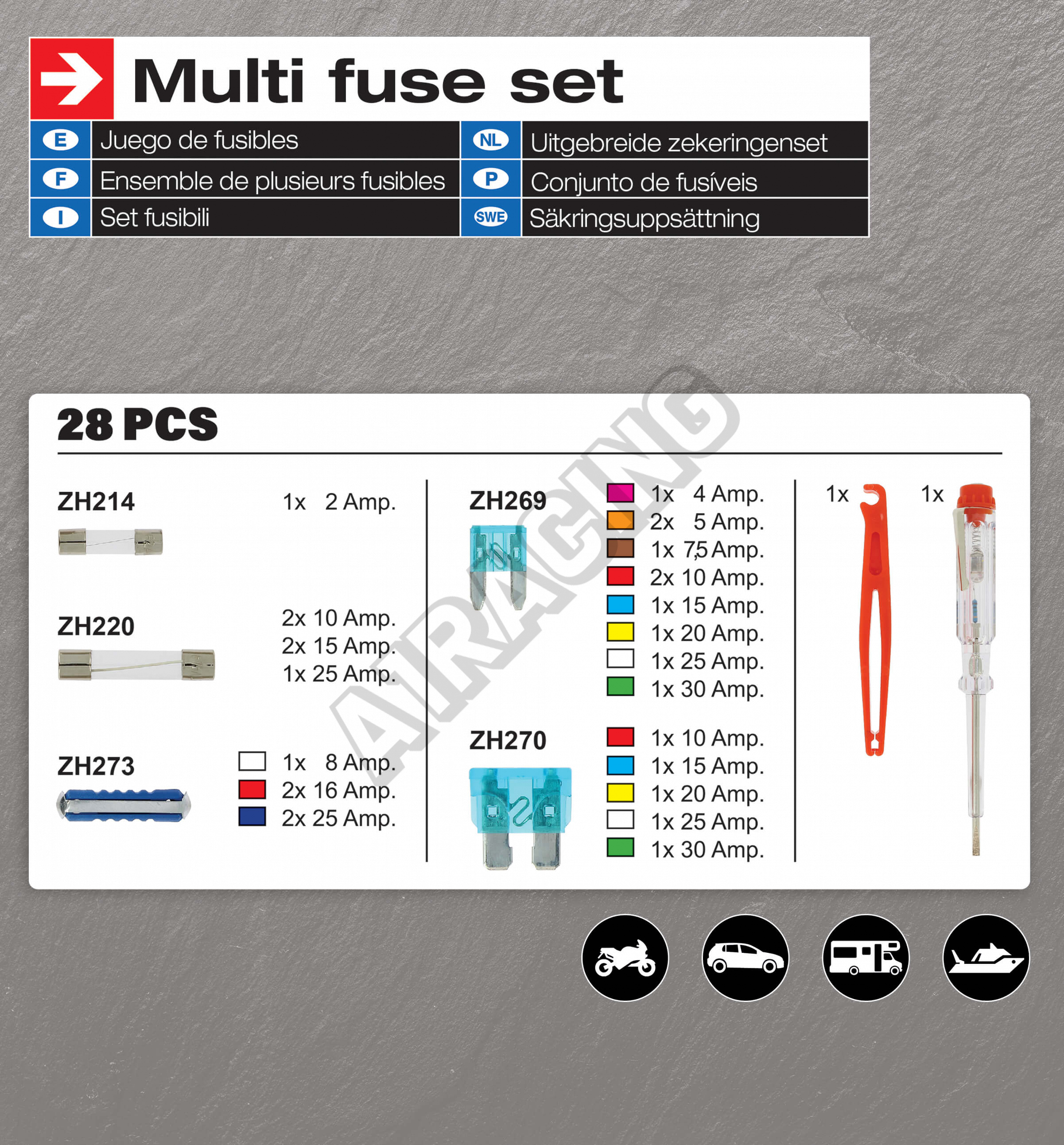 Univerzálna sada malých, veľkých i sklenených poistiek vrátane skúšačky a vyťahovacích klieští. Kompletný rozpis je vidieť v galérii fotiek.