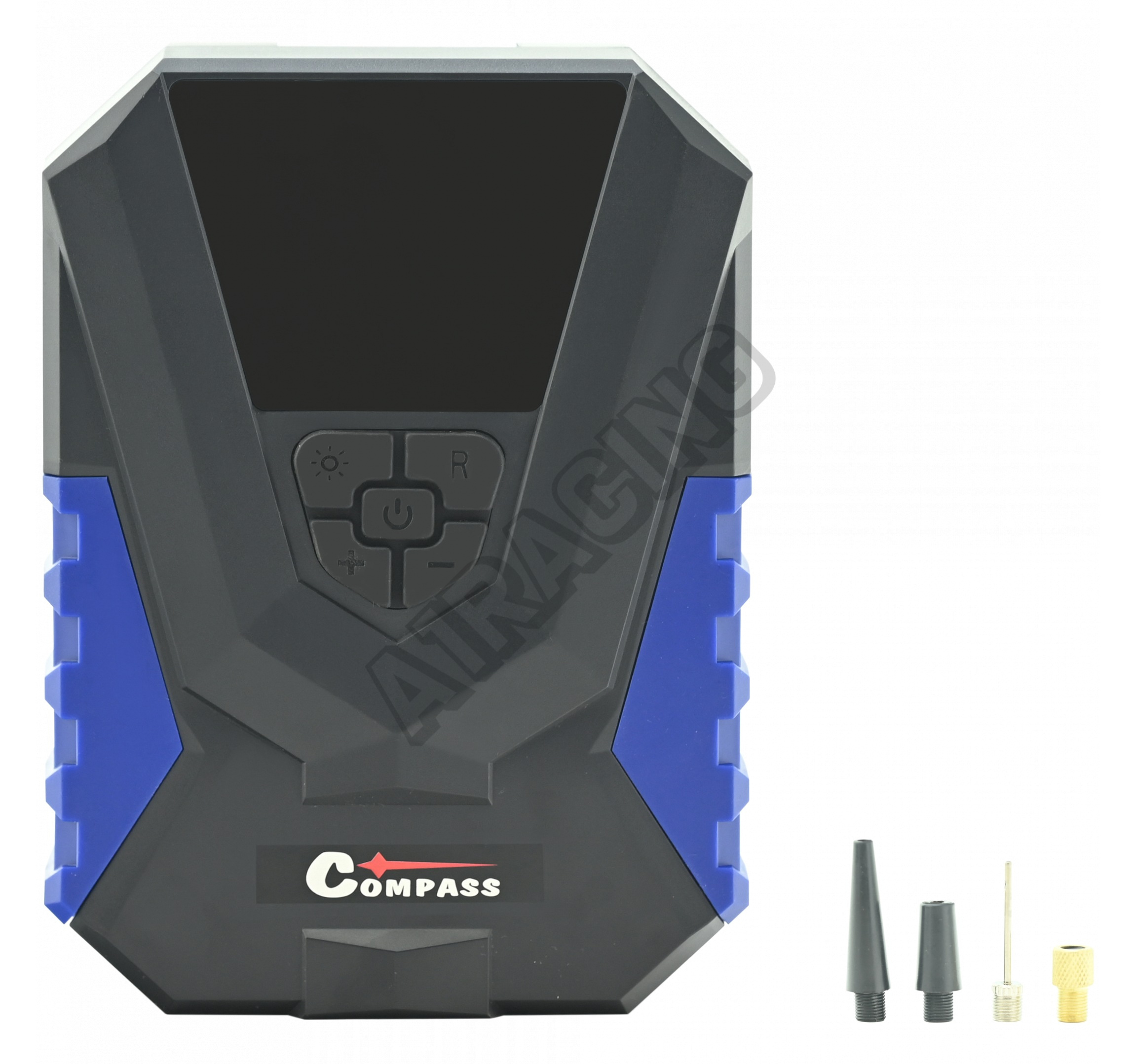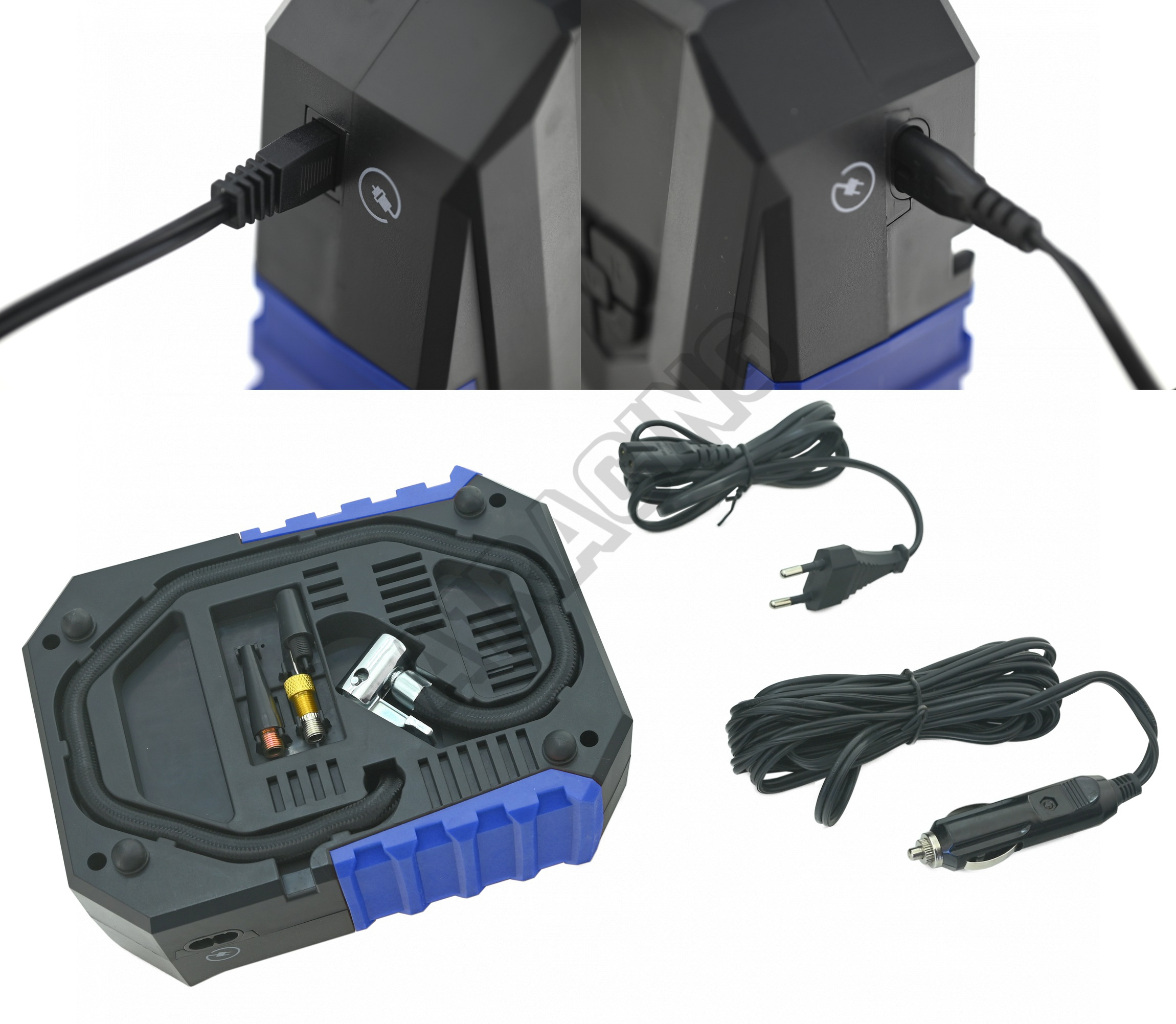 Kompresor je vhodný k huštění pneumatik osobních automobilů, motocyklů či jízdních kol na předem nastavený tlak. Vzduchová hadice je ukryta ve spodní části zařízení a má délku 45 cm. Součástí balení jsou rovněž adaptéry pro další použití (huštění míčů, matrací, bazénů apod.)