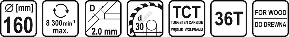 Technická data průměr kotouče 160 mm průměr otvoru 30 mm počet zubů 36 šíře řezu 2,0 mm šíře kotouče 1,4 mm max. povolené otáčky 8300 ot/ min