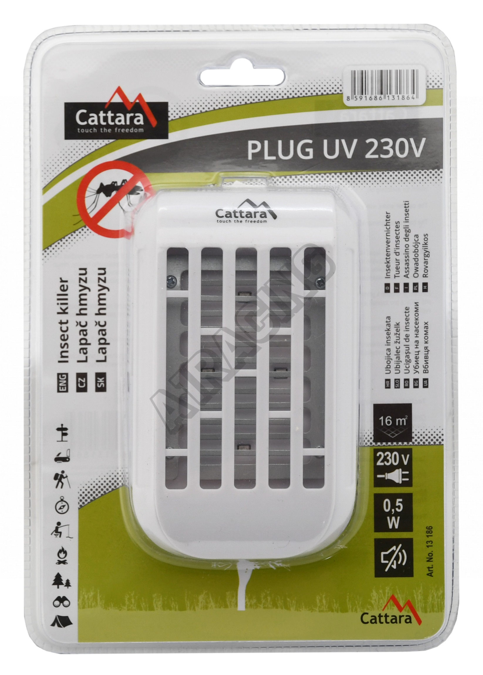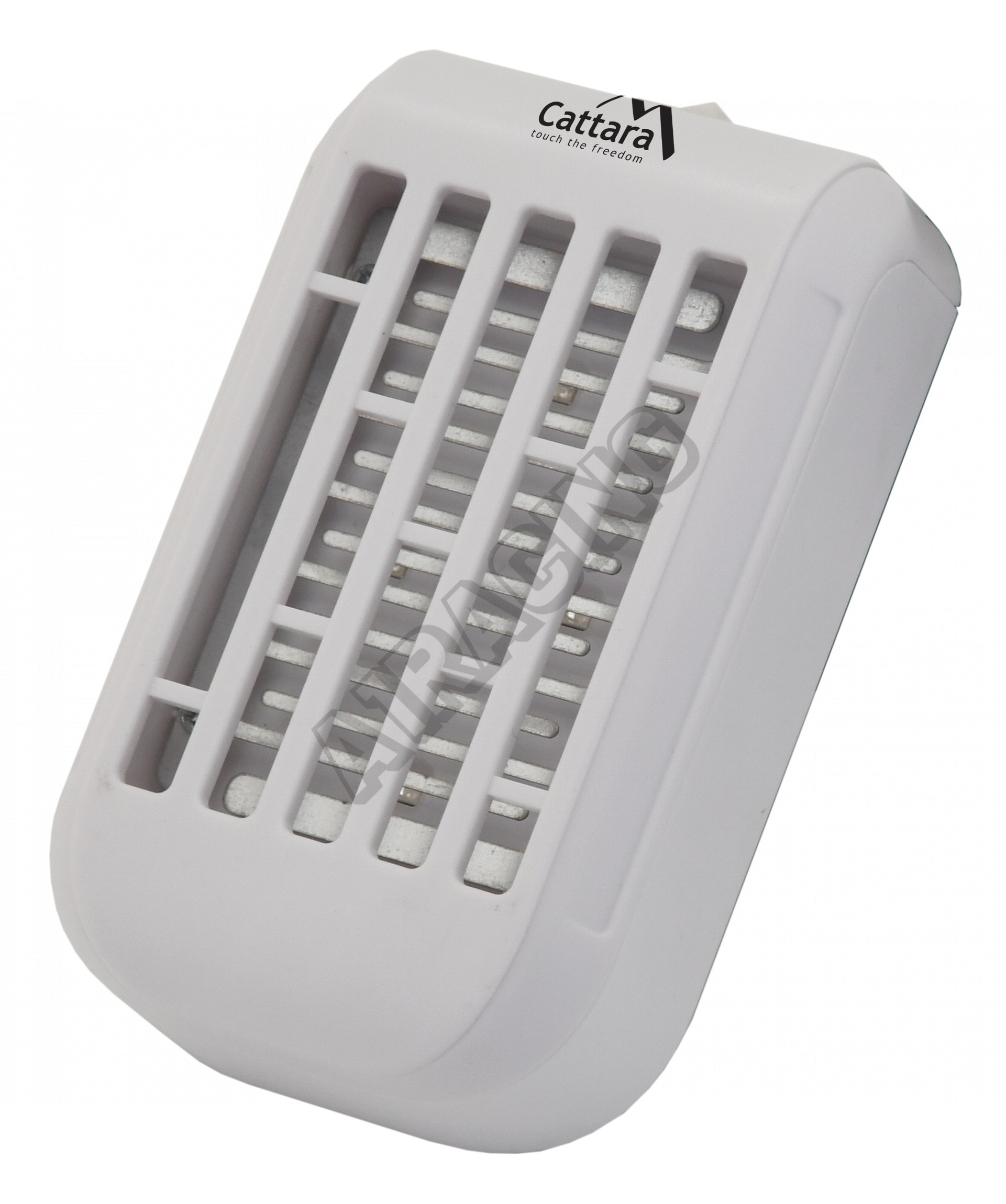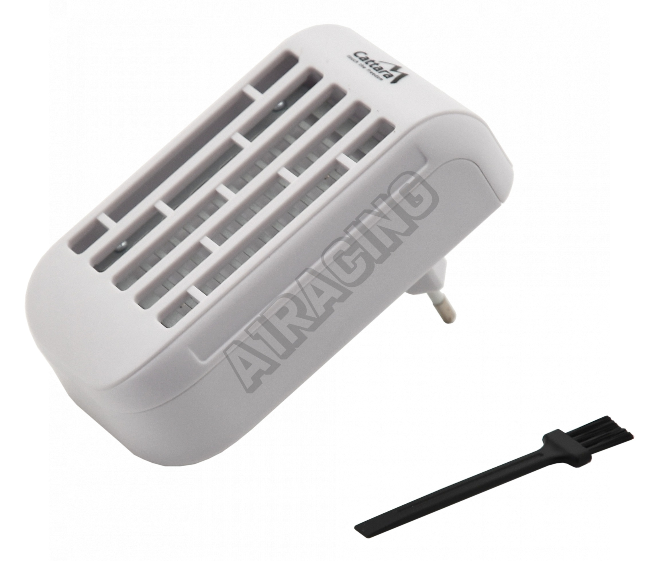 Elektronický lapač hmyzu k uchycení (zapojení) do zásuvky 230V, využívající UV LED k přilákání létavého hmyzu. Hmyz je po kontaktu s kovovou sítí pod vysokým napětím zahuben elektrickým proudem.