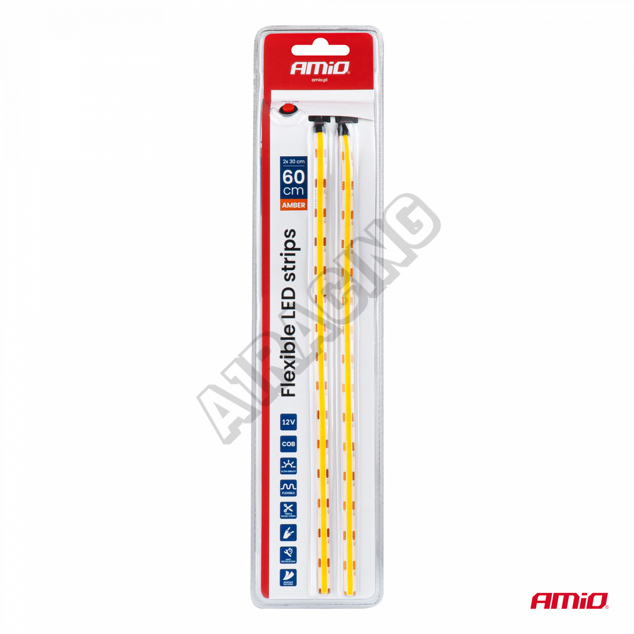 Flexibilné LED pásiky vyrobené v technológii COB, určené na inštaláciu do vozidiel 12V. Každá sada obsahuje dva pásiky s dĺžkou 30 cm, vyžarujúce intenzívne svetlo v jantárovej farbe. Konštrukcia typu Flexible umožňuje jednoduché prispôsobenie tvaru montážnej plochy. Produkt je vybaven testovacou funkciou "vyskúšaj ma", ktorá uľahčuje prezentáciu jeho fungovania na predajnom mieste.