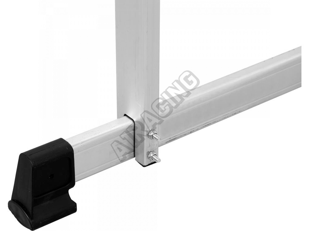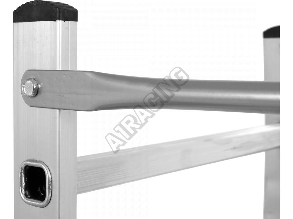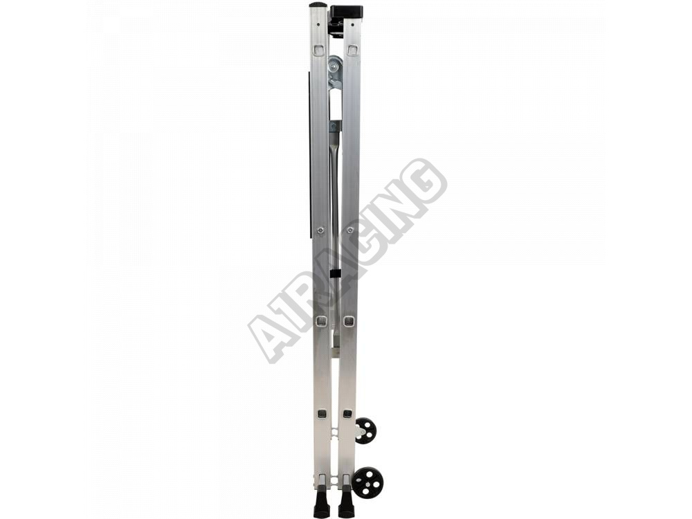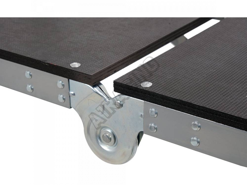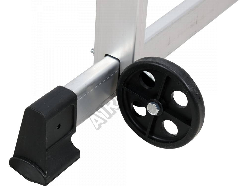 Lešení je vybavené gumovými protiskluzovými nožičkami a dvěma kolečky pro snadnou přepravu.