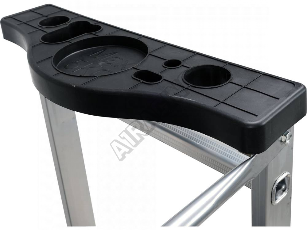 Pracovní plošina z voděodolné překližky, nad horní příčkou je umístěn stojan pro bezpečné uložení nářadí nebo nádob na barvy.