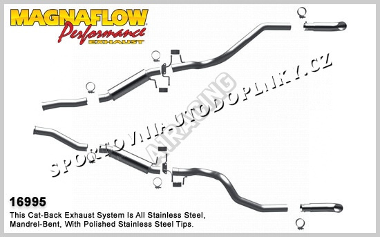 Sportovní výfukové systémy kultovní americké firmy Magnaflow patří spolu s Borlou mezi absolutní špičku ve výrobě sportovních výfuků hlavně v USA. Sportovní konstrukce v nerez provedení s leštěnými koncovkami je přesně stavěna pro daný model auta pro maximální možné navýšení výkonu. Přední úpravci často volí tuto značku jako záruku vysoké kvality, funkčnosti i nádherného zvuku. Naše firma je přímo autorizovaným prodejcem těchto výfuků pro ČR a proto vám můžeme poskytnout plnou záruku a maximální pomoc při výběru správného výfuku, Některé výfuky držíme přímo skladem a je možné je vidět na naší prodejně v Ostravě. Pokud daný výfuk je skladem v Evropě, u nás jej máme do 10 dnů, pokud je výfuk jen v USA, doba dodání je 2-3 měsíce, letecky do 10 dnů je přirážka 4000,- Kč bez DPH. Nahoře vedle hlavní fotky najdete v souborech často montážní listy, fotky i videa daného modelu auta.