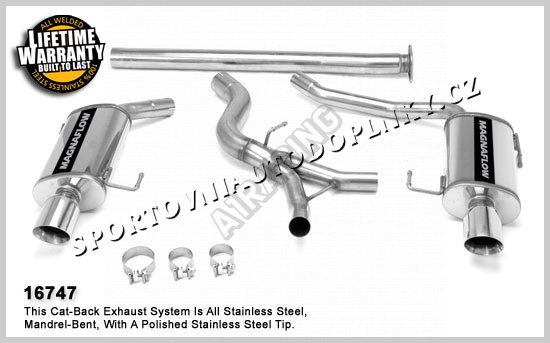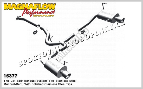 Sportovní výfukové systémy kultovní americké firmy Magnaflow patří spolu s Borlou mezi absolutní špičku ve výrobě sportovních výfuků hlavně v USA. Sportovní konstrukce v nerez provedení s leštěnými koncovkami je přesně stavěna pro daný model auta pro maximální možné navýšení výkonu. Přední úpravci často volí tuto značku jako záruku vysoké kvality, funkčnosti i nádherného zvuku. Naše firma je přímo autorizovaným prodejcem těchto výfuků pro ČR a proto vám můžeme poskytnout plnou záruku a maximální pomoc při výběru správného výfuku, Některé výfuky držíme přímo skladem a je možné je vidět na naší prodejně v Ostravě. Pokud daný výfuk je skladem v Evropě, u nás jej máme do 10 dnů, pokud je výfuk jen v USA, doba dodání kontejnerem je 2-3 měsíce, letecky 10-14 dnů s přirážkou od 6000,- Kč bez DPH podle velikosti a váhy výfuku. Nahoře vedle hlavní fotky najdete v souborech často montážní listy, fotky i videa daného modelu auta.