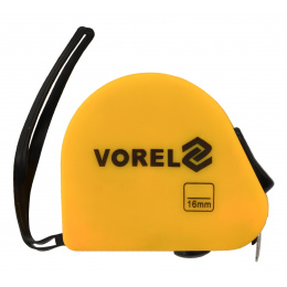 Svinovací metr 5 m dlouhý a 16 mm široký zakončený pohyblivým háčkem. Pouzdro je vyrobeno z plastu, vyztuženo gumovými podložkami a aretačním knoflíkem.