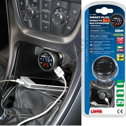 Smart-Plug, multifunkčný zástrčka 12 / 24V. Teplomer na indikáciu teploty vo vnútri vozidla (-9 ° C / + 80 ° C). Voltmeter 12/24 pre sledovanie úrovne nabitia a dobrú funkciu alternátora. USB konektor, 5V, 2100 mA pre pripojenie a nabíjanie akéhokoľvek funkčného zariadenia cez USB.