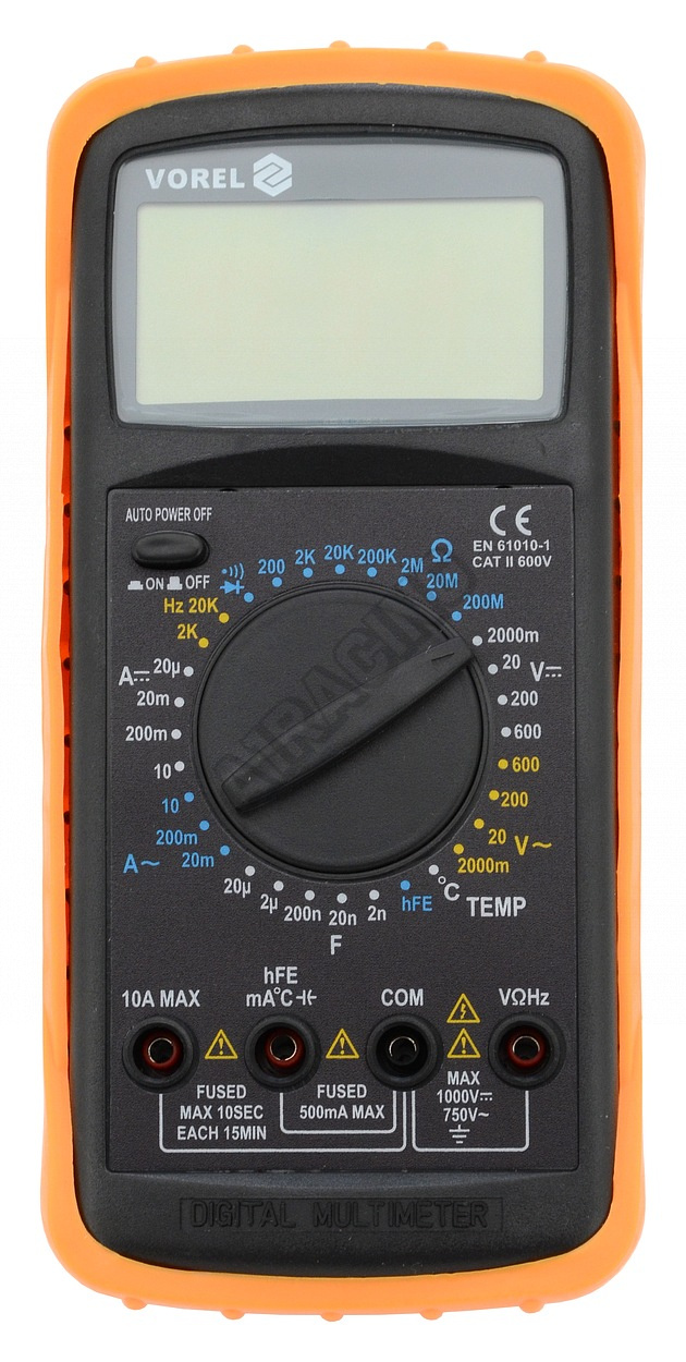 Namerané hodnoty sa zobrazujú na prehľadnom LCD displeji odolného, plastového tela prístroja. Telo je navyše umiestnené v odnímacom silikónovom obale, ktorý zaisťuje čiastočnú ochranu pred vlhkosťou, nečistotami av neposlednom rade chráni prístroj pred vibráciami. K meraču sú priložené kvalitné káble s meracími hrotmi.