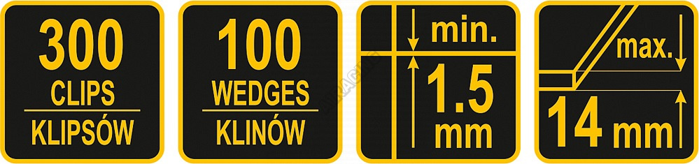 Sada se skládá ze sady 300 x spon a znovu použitelných 100 x klínů z kvalitního plastu.