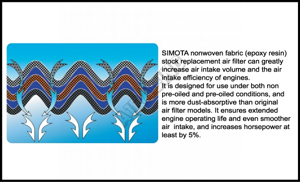Panelové filtre SMOTA sú navrhnuté za účelom navýšenia výkonu a krútiaceho momentu. Vysoká priepustnosť vzduchu u týchto filtrov zvýši kvalitu existujúceho systému sania a na rozdiel od bežných originálnych papierových filtrov sú tieto filtre vyrobené z bavlny, ktorá je napustená špeciálnym olejom. S použitím špeciálneho prípravku na čistenie a údržbu je možné filter čistiť, čo umožňuje jeho opätovné použitie. Výhody panelového filtra: zvyšuje výkon a krútiaci moment o 5% znižuje spotrebu paliva zvyšuje pružnosť motora Tento filter je určený namiesto sériového vzduchového filtra bez akýchkoľvek úprav! Montáž výmenným spôsobom behom pár minút. Vzduchová vložka filtra do air-boxu namiesto filtra papierového.