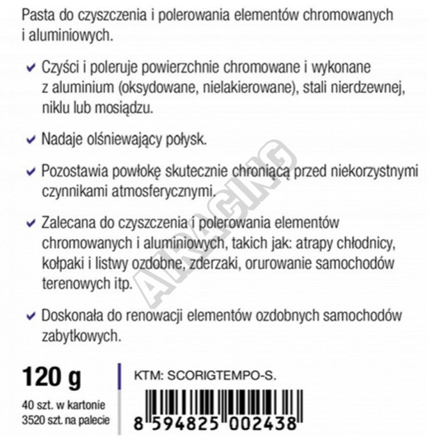 Pasta na čistenie a leštenie chrómovaných a hliníkových povrchov.Čistí a leští chrómované povrchy a
