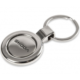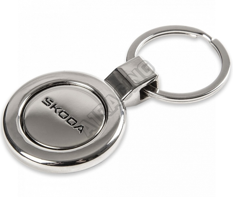 Kovová kľúčenka s logom ŠKODA s odnímateľným žetónom na zadnej strane. Veľkosť žetónu zodpovedá minci v hodnote 10 CZK.
