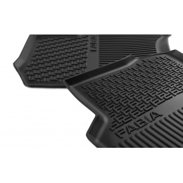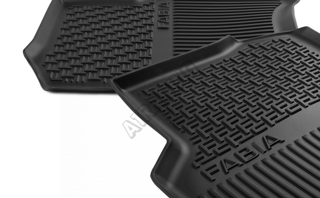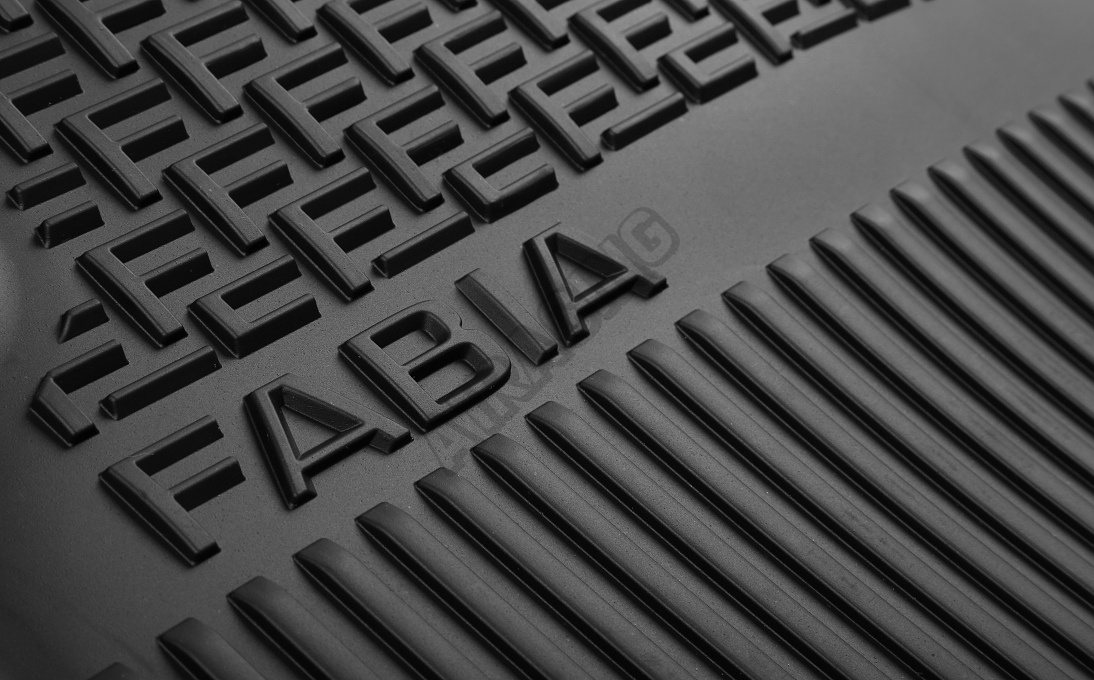 Originálne gumové zadné koberce so zvýšeným okrajom, presne tvarované. Upevnenie pomocou úchytov. Nápis Fabia.