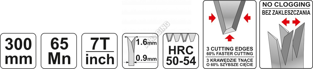 Zuby kalené na 50-54 HRC. Počet zubů 7 TPI. Rukojeť je otevřená.
