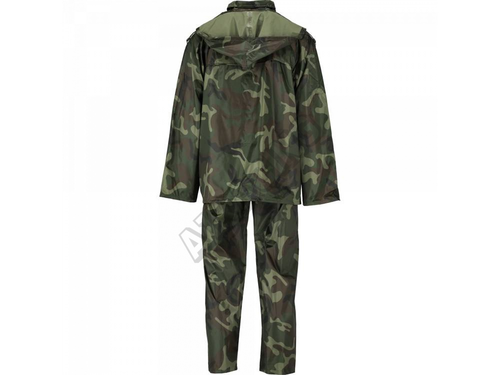 Maskáčová 2-dílná deštivzdorná sada kalhot a bundy. Bunda se dvěma velkými kapsami a nastavitelnou kapucí, kalhoty s elastickým pasem a rozparky na bocích, kterými se dostaneme do kapes kalhot. Směs PVC a polyesteru je voděodolný a vzduchotěsný materiál. Přebytečné teplo uniká zpod materiálu ventilačními štěrbinami na zádech a otvory pod pažemi.