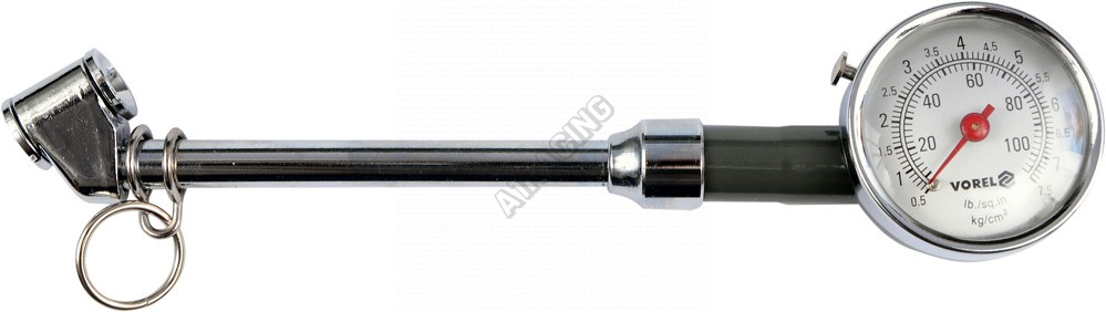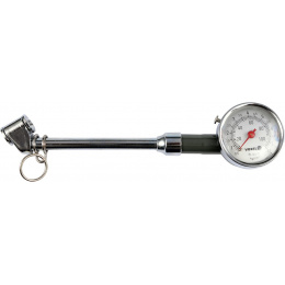 Dlouhý kovový pneuměřič. Měřicí rozsah 0,05-0,75 MPa, 0,5-7,5 bar.