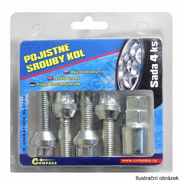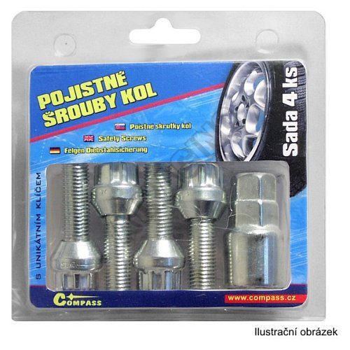 Pojistné šrouby kol ochraňují kola před demontáží běžným nářadím. Sada 4 kusy + unikátní klíč, montuje se vždy pouze jeden pojistný šroub na jedno kolo. Použitelné pro slitinové i ocelové disky. Vhodné např. pro vozy Favorit a Felicia od r.v. 93, více viz tabulka použití.