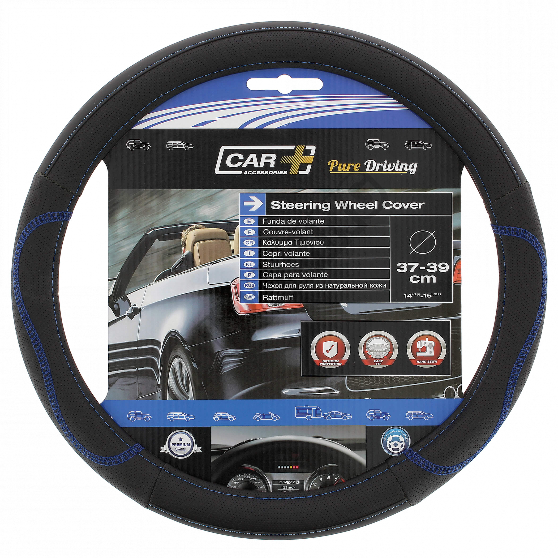 Kvalitný poťah na volant s modrým prešitím. Po celom obvode má dierovanie, ktoré znižuje neskĺznutie rúk z venca volantu. Určené pre priemery volantov 37-39 cm.