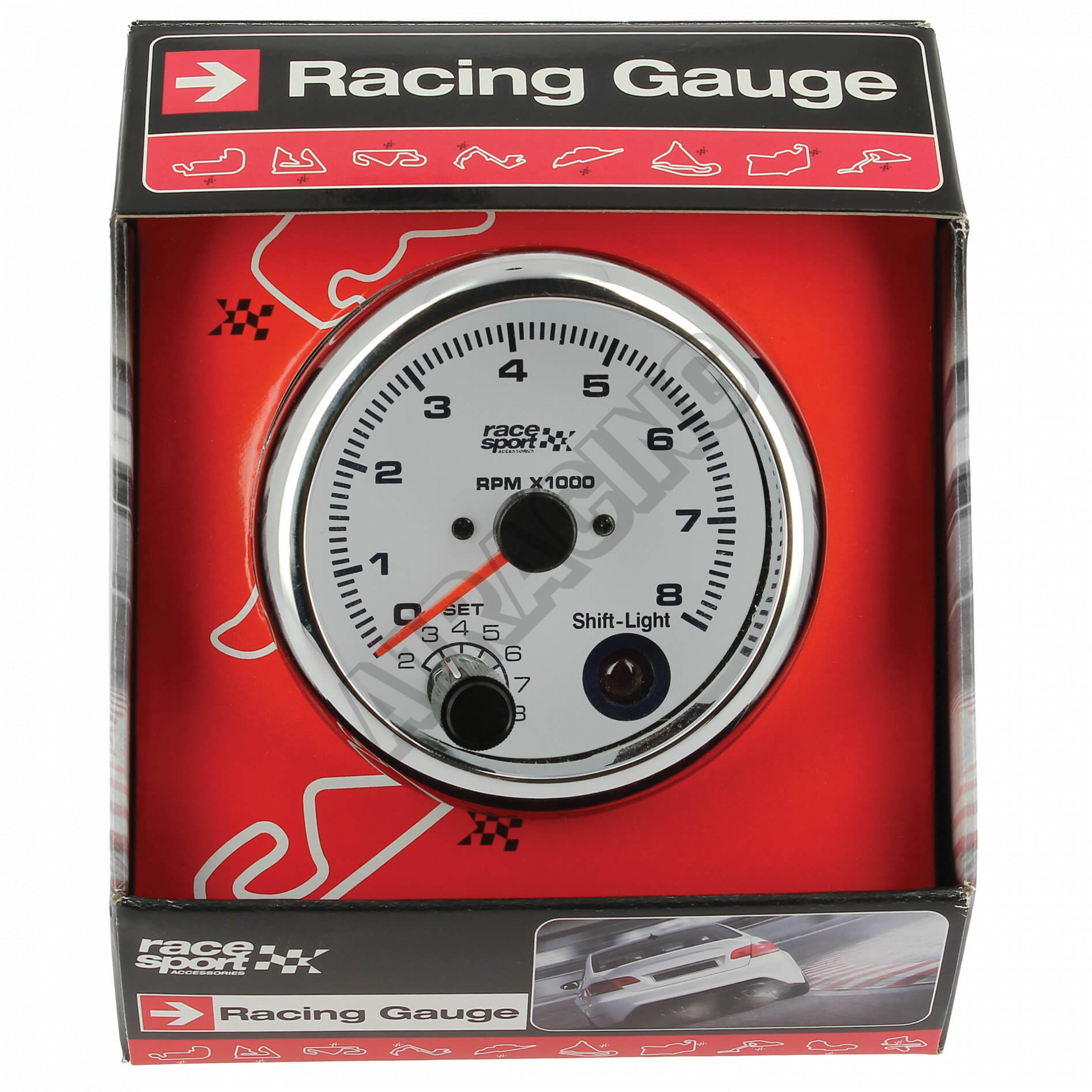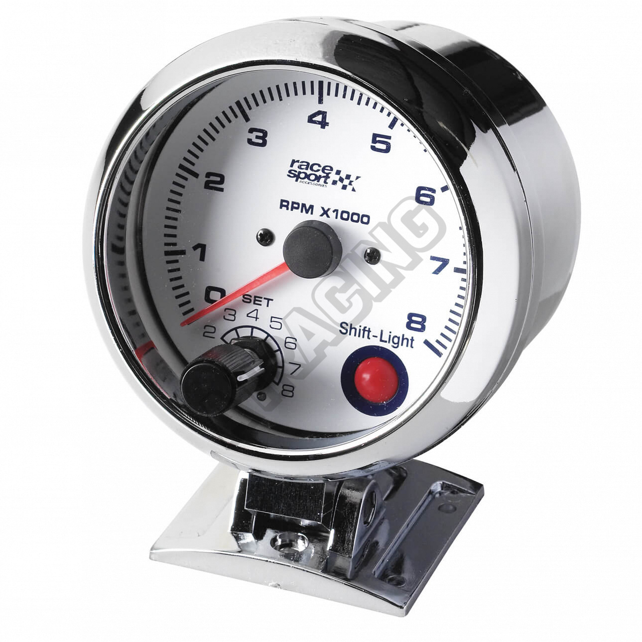 Prídavný otáčkomer Race Sport 90 mm 0-8000 RPM - nastaviteľný shift, biely AKCIA, CENA PLATÍ LEN DO