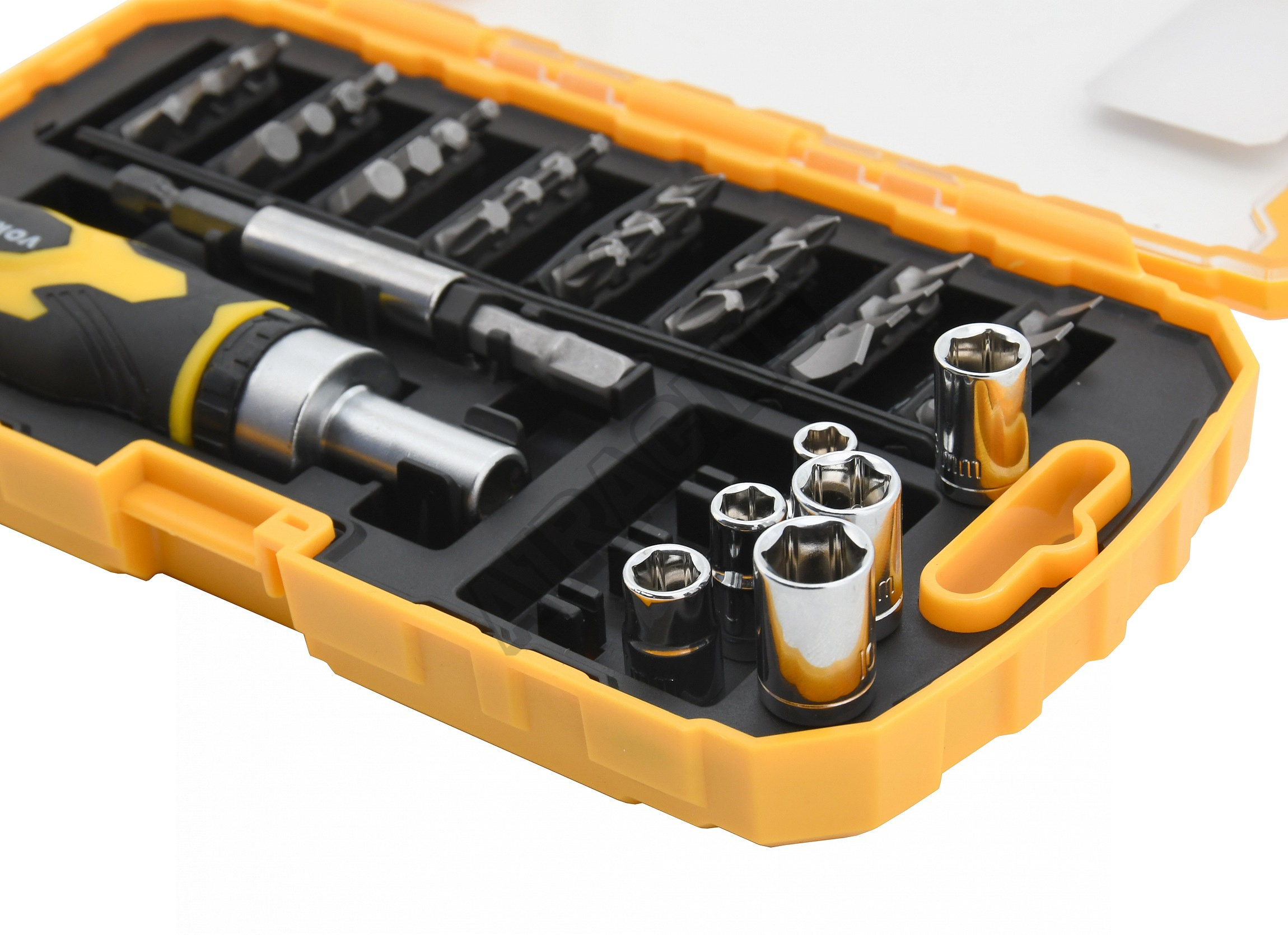 Praktická sada ráčnového šroubováku s bity a nástavci. Nářadí je precizně zpracováno z CrV oceli a j