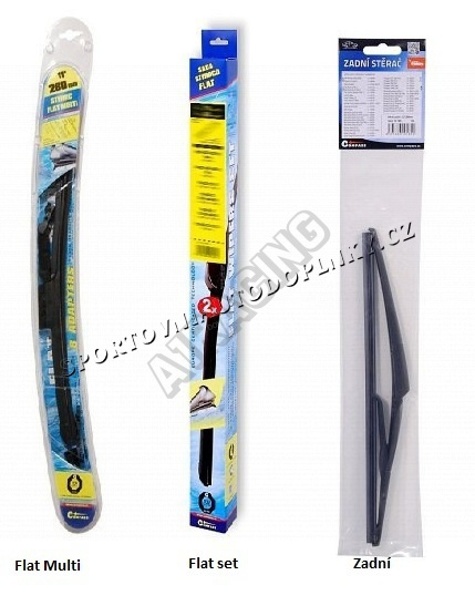 Stěrače FLAT SET (sada 2 ks na celé auto). Vysoce kvalitní pružný člen plochého stěrače zajišťuje stejnoměrný tlak grafitového břitu v celé jeho délce, což zamezuje rozmazávání nečistot a vytváření pruhů.