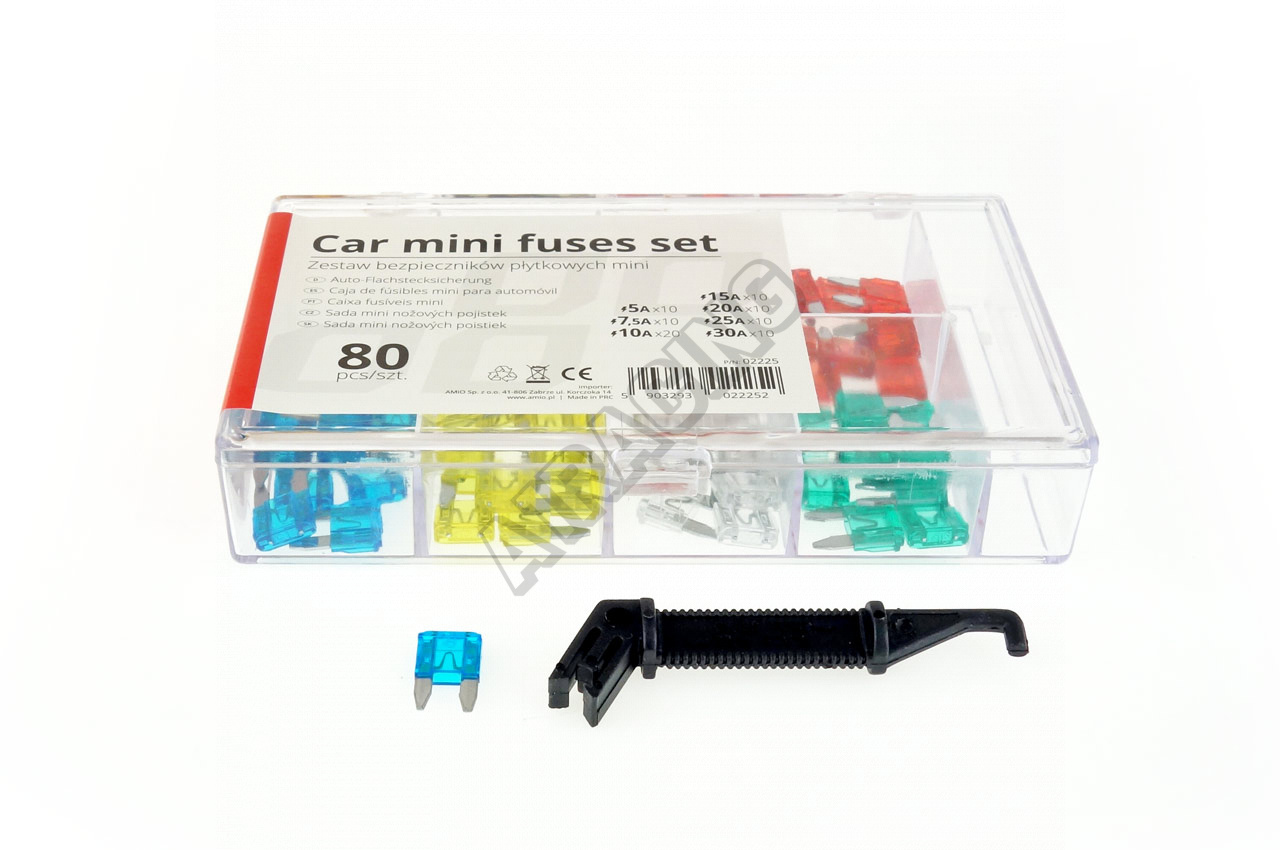- Obsah sady: 10x5A, 10x7.5A, 20x10A, 10x15A, 10x20A, 10x25A, 10x30A, kliešte (úchop)