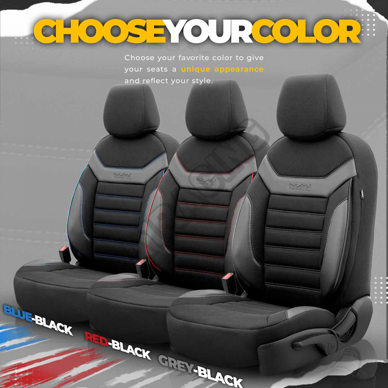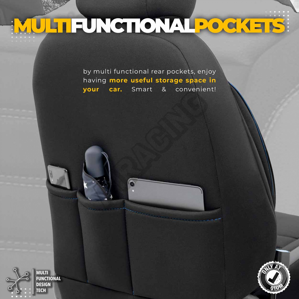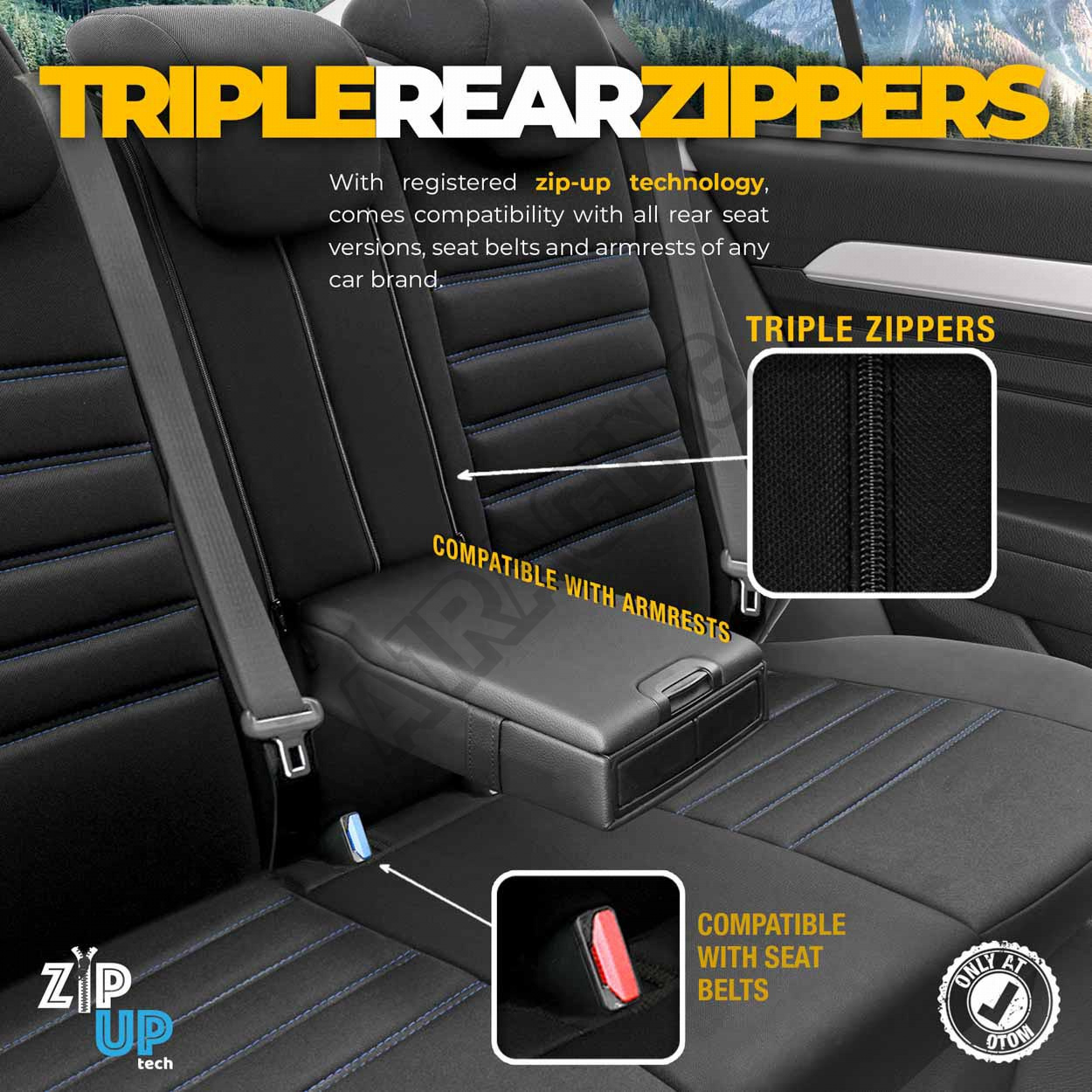 Poťahy majú zipsy na zadnej lavici, vďaka čomu pasujú na väčšinu sedadiel dostupných na trhu, (lavíc nedelených, delených pravostranných aj ľavostranných).