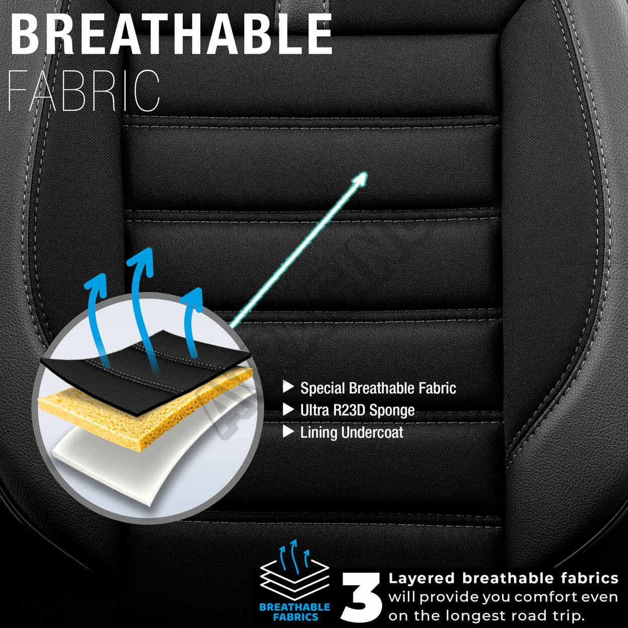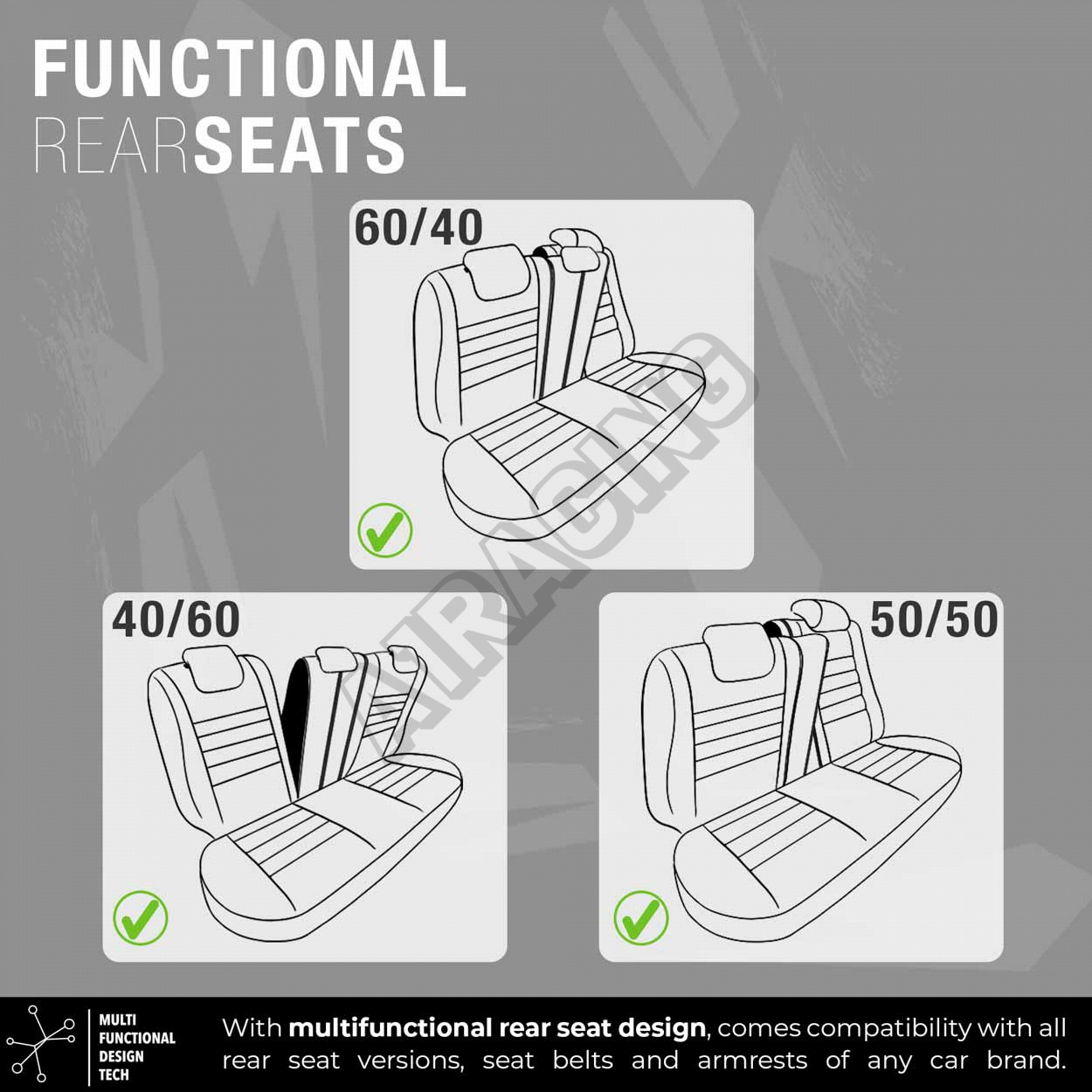 Poťahy majú zipsy na zadnej lavici, vďaka čomu pasujú na väčšinu sedadiel dostupných na trhu, (lavíc nedelených, delených pravostranných aj ľavostranných).