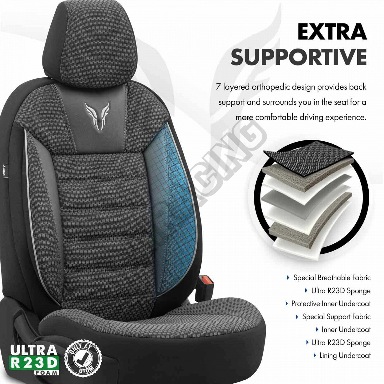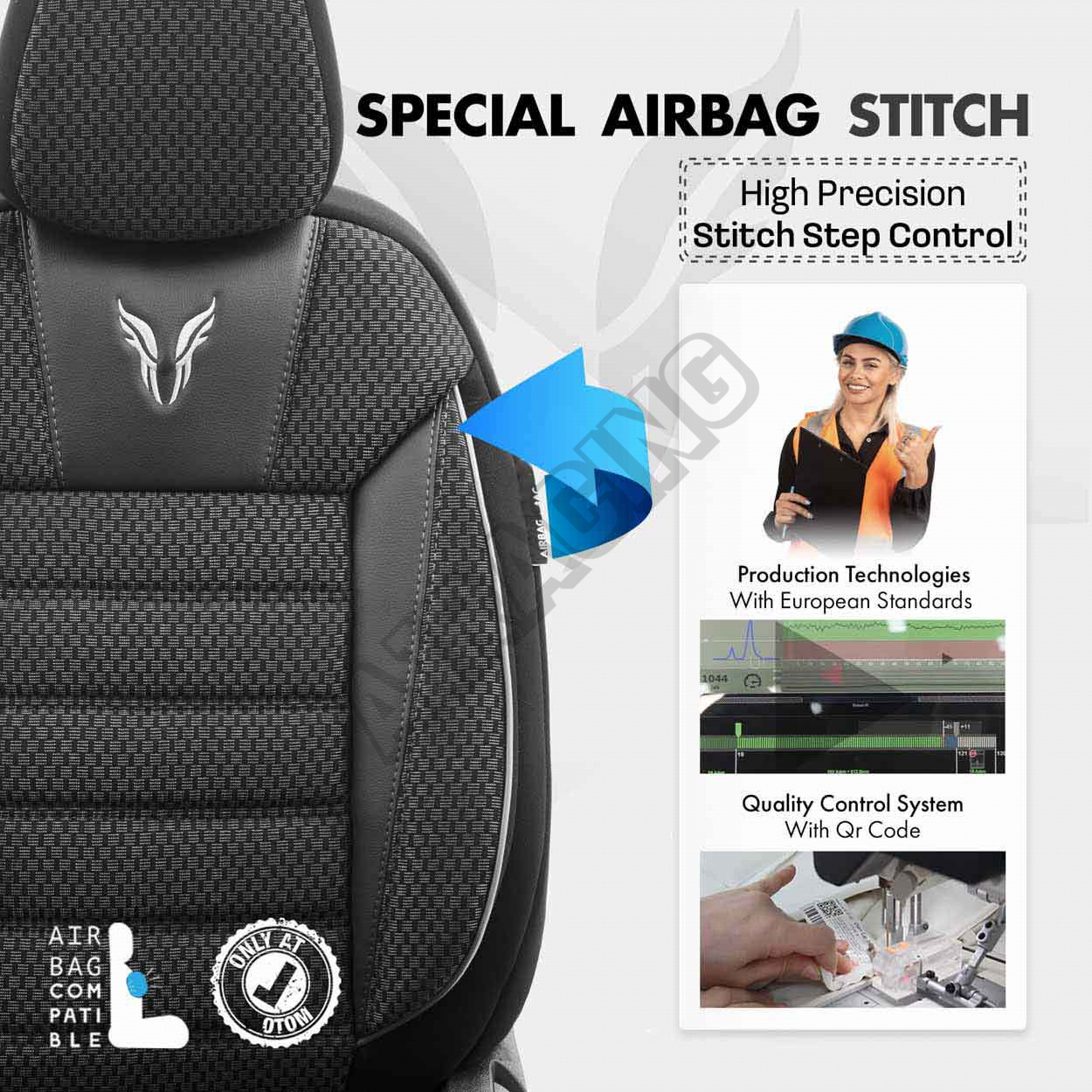 Poťahy v štandarde majú certifikovaný šev AIRBAG, vďaka čomu sú prispôsobené pre automobily ako s bočnými airbagmi v sedadlách, tak aj pre štandardné sedadlá.