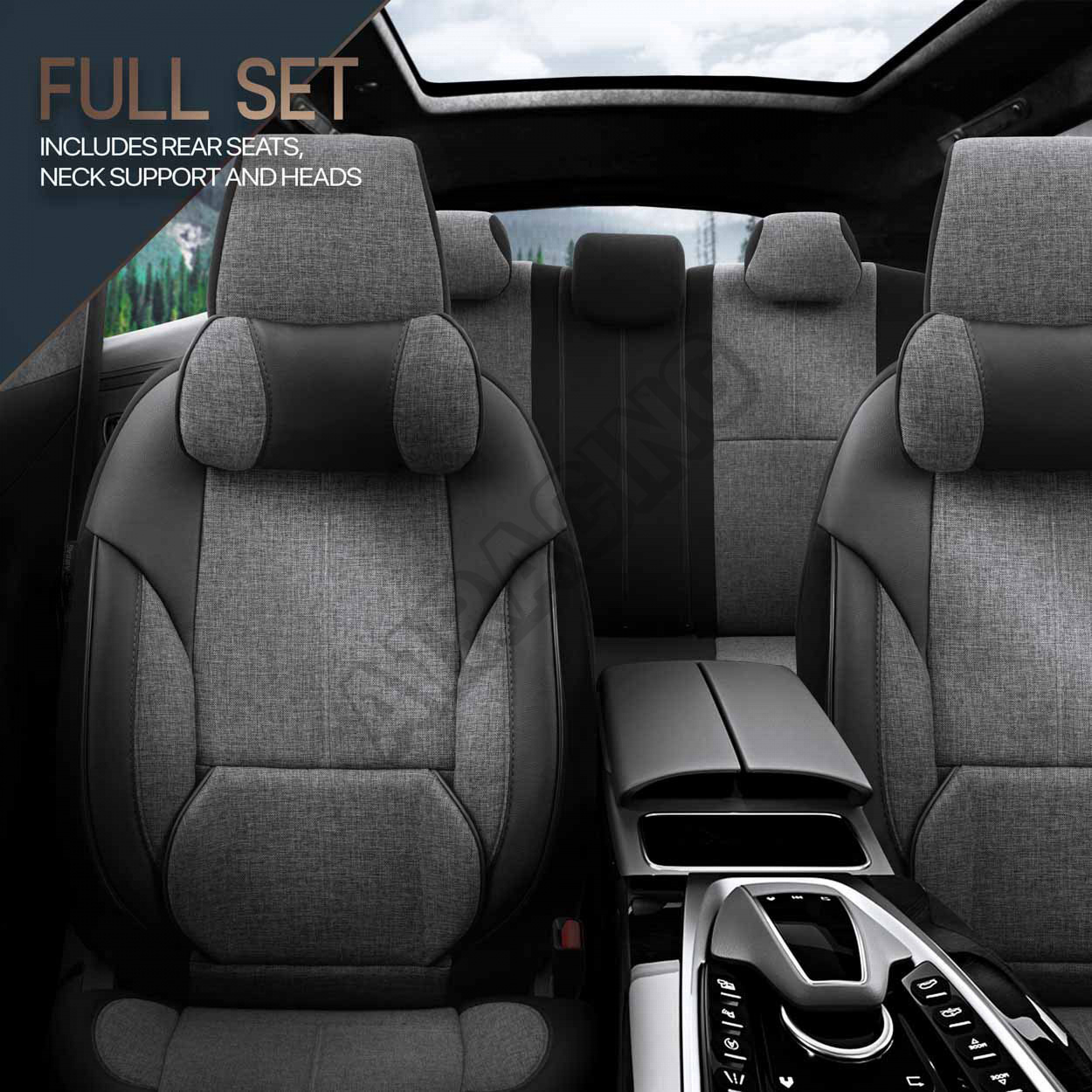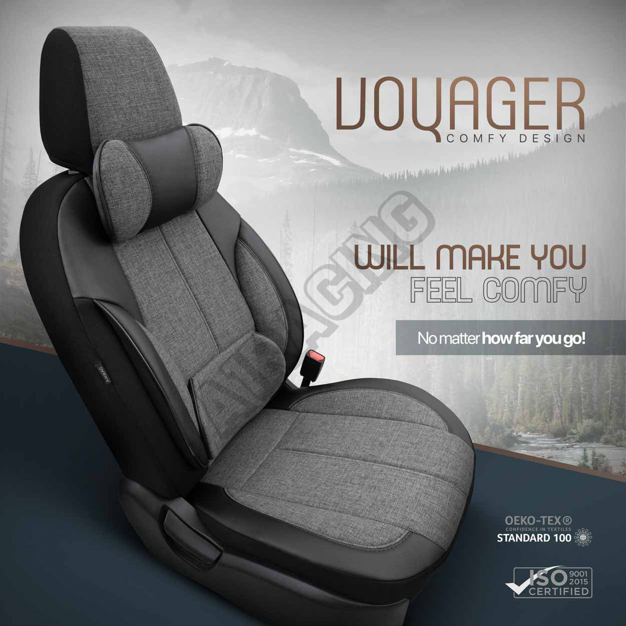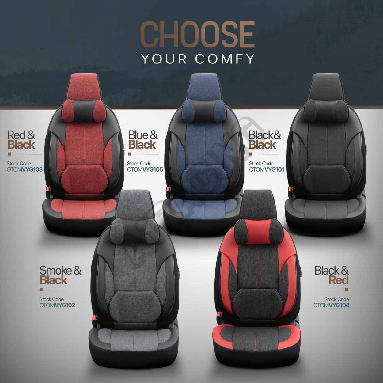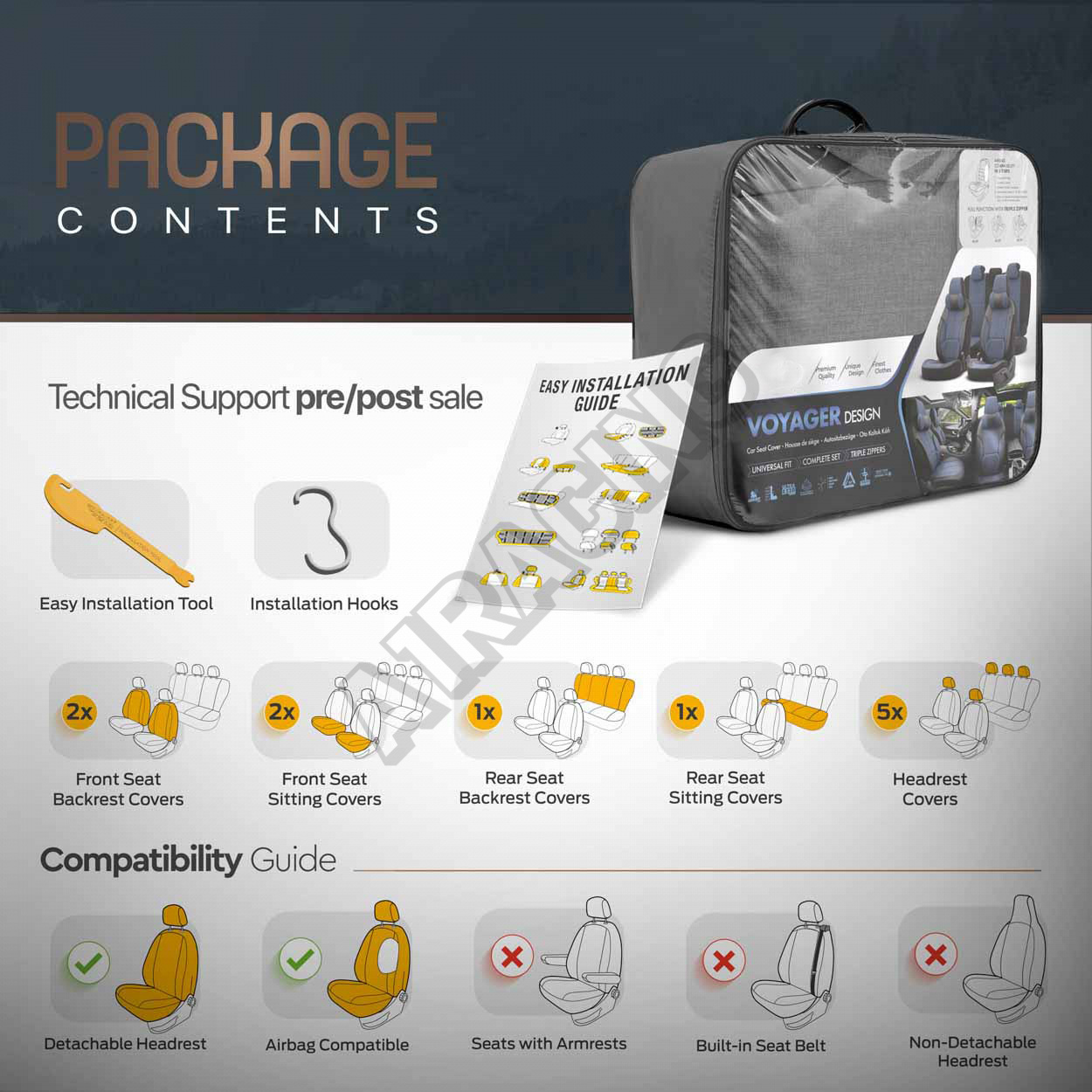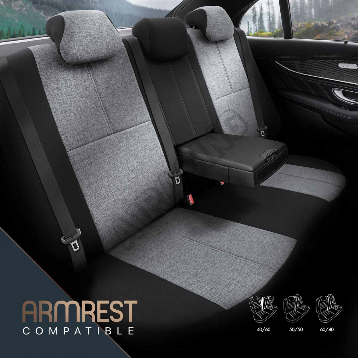 Poťahy majú zipsy na zadnej lavici, vďaka čomu pasujú na väčšinu sedadiel dostupných na trhu, (lavíc nedelených, delených pravostranných aj ľavostranných).