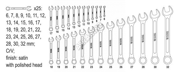 Klíče jsou uložené v pouzdře ze syntetické tkaniny s možností zavěšení, balení obsahuje klíče 6, 7, 8, 9, 10, 11, 12, 13, 14, 15, 16, 17, 18, 19, 20, 21, 22, 23, 24, 25, 26, 27, 28, 30 a 32 mm.